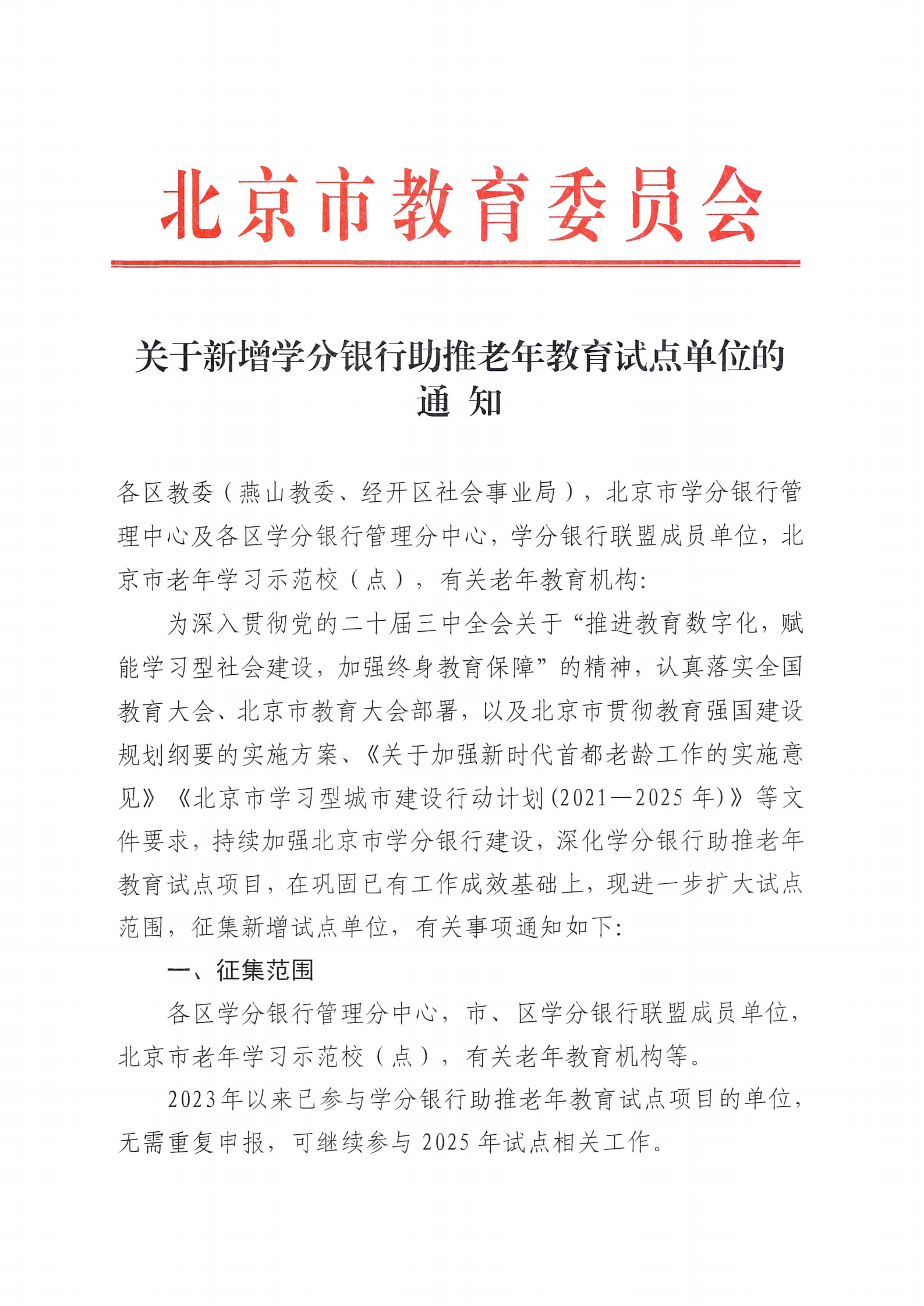 市教委关于新增学分银行助推老年教育试点单位的通知